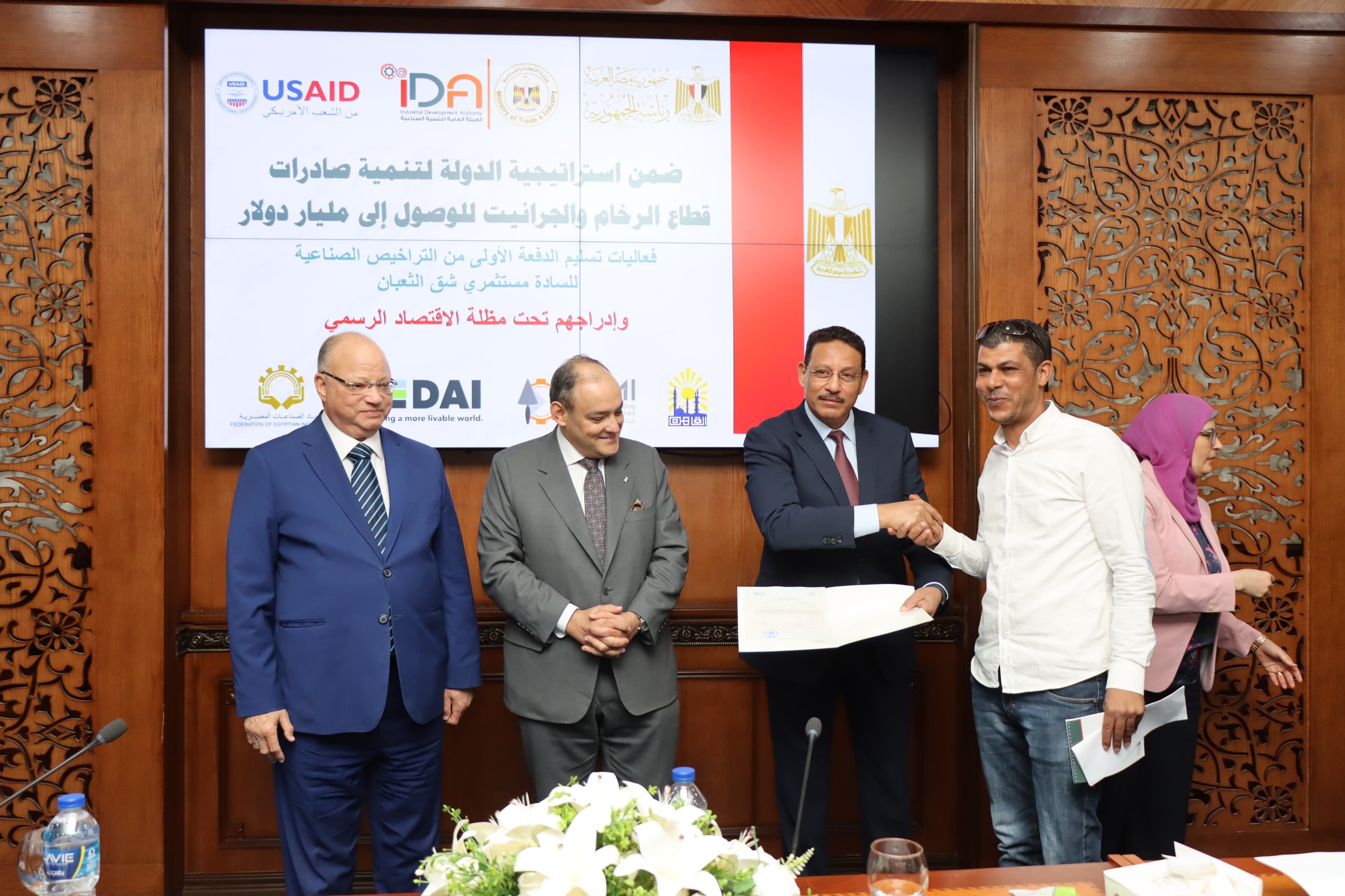 هذا وقد تمت مراسم تسليم التراخيص بالتعاون مع مشروع اعمال مصر الممول من الوكالة الامريكية USAID وشهد الاحتفالية قيادات وزارة التجارة والصناعة والمحافظة وهيئة التنمية الصناعية، والمهندس / السيد أباظة نائب رئيس غرفة مواد البناء والسيدة / لورا جونزاليس مديرة النمو الاقتصادي بالوكالة الامريكية للتنمية الدولية، والسيدة اميرة شكري رئيس فريق تيسير مناخ الأعمال وتنمية المشروعات إلى جانب مصنعي ومستثمري المنطقة.