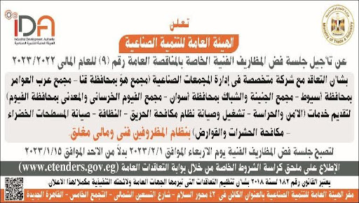 تعلن الهيئة العامة للتنمية الصناعية عن تأجيل جلسة فض المظاريف الفنية الخاصة... المزيد